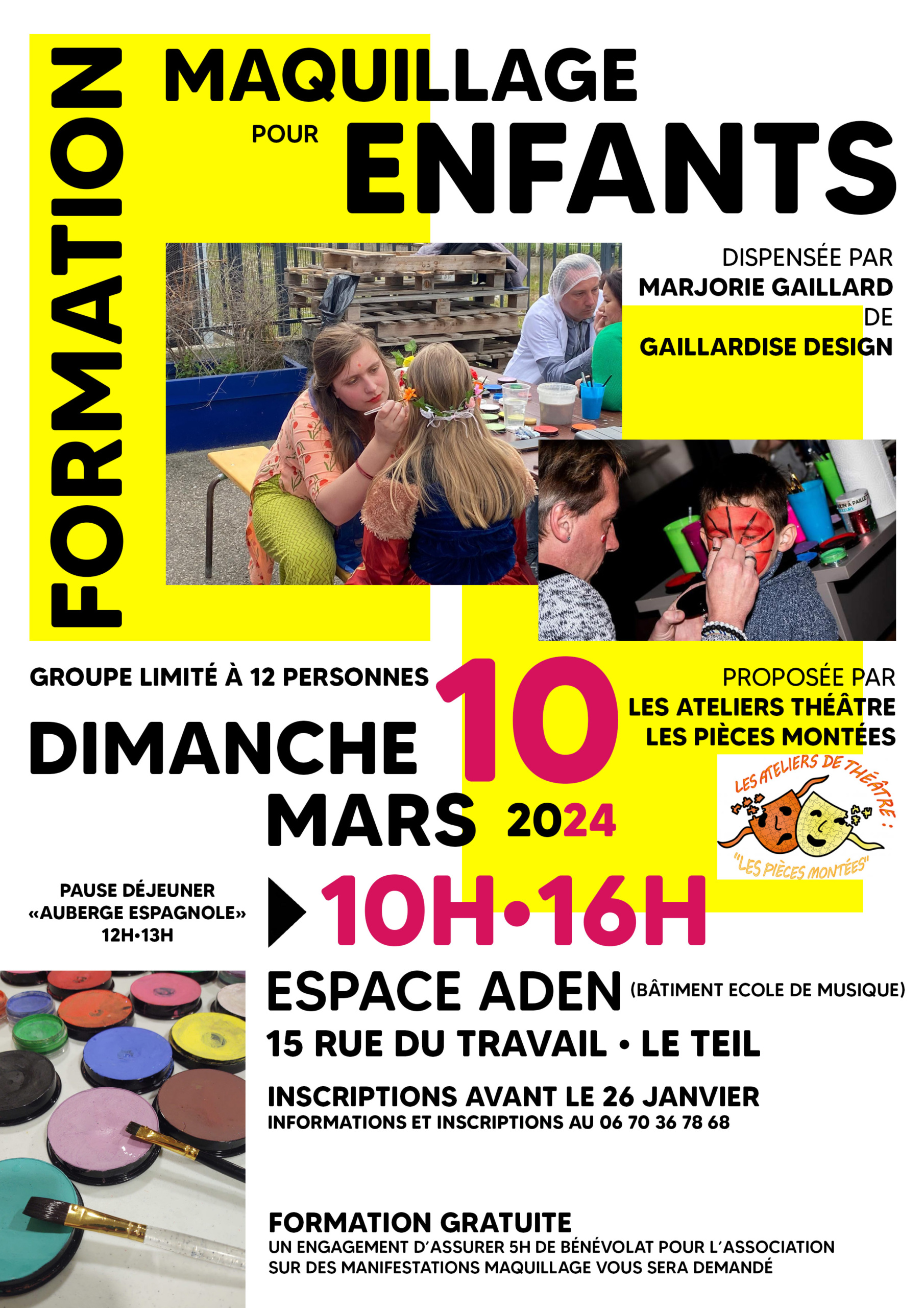 Les Ateliers théâtre les Pièces Montées vous proposent une formation de maquillage pour enfants le dimanche 10 mars dispensée par Marjorie Gaillard.