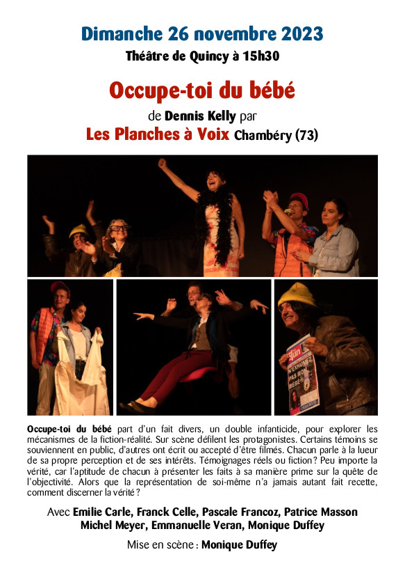 “Occupe-toi du bébé” part d’un fait divers, un double infanticide, pour explorer les mécanismes de la fiction-réalité. Sur scène défilent les protagonistes. Certains témoins se souviennent en public, d’autres ont écrit ou accepté d’être filmés. Chacun parle à la lueur de sa propre perception et de ses intérêts. Témoignages réels ou fiction? Peu importe la vérité, car l’aptitude de chacun à présenter les faits à sa manière prime sur la quête de l’objectivité. Alors que la représentation de soi-même n’a jamais autant fait recette, comment discerner la vérité ?
