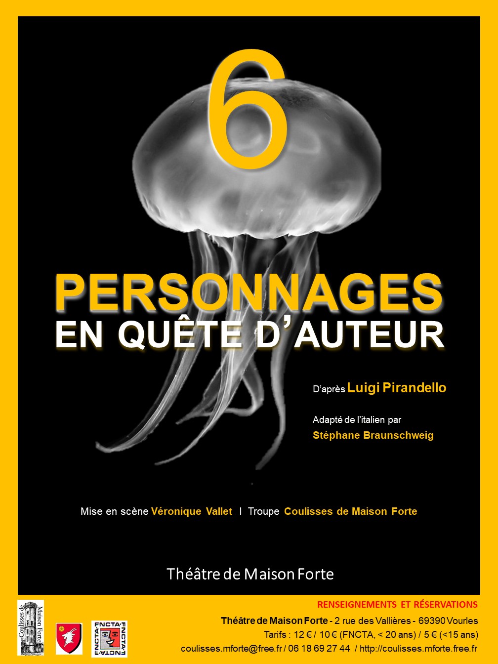 Six personnages de littérature égarés font irruption sur un plateau de théâtre devant le regard médusé d’une troupe qui répète dans les lieux. Ils réclament le droit à l’existence, viennent raconter leur drame et surtout vivre deux scènes clés qui les tourmentent, les déchirent et les plongent dans une incompréhension mutuelle. Ils déversent leur histoire par fragments tout en se disputant entre eux. La scène devient une espèce de tribunal ou chacun exprime sa rancune, sa douleur, son amertume, sa honte, sa colère, son mépris… Ces personnages sont en quelque sorte des œuvres d’art inachevées, vivantes et en mouvement. Ce sont des êtres libres et autonomes qui réclament de vivre avec ou sans l’avis de l’auteur qui les a créés. Mais paradoxalement ils sont aussi dépendants d’un auteur pour parachever leur existence.