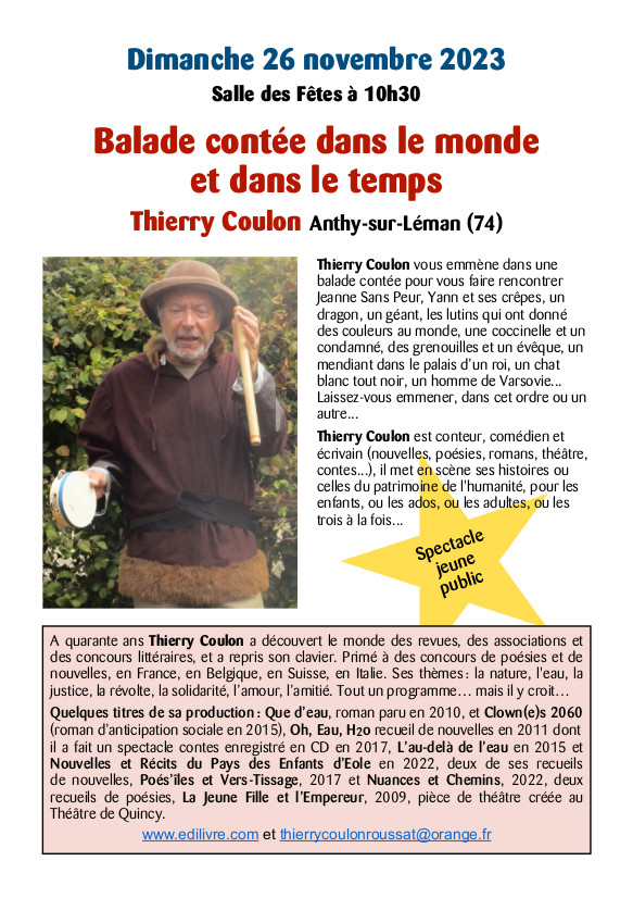 Thierry Coulon est conteur, comédien et écrivain (nouvelles, poésies, romans, théâtre, contes…), il met en scène ses histoires ou celles du patrimoine de l’humanité, pour les enfants, ou les ados, ou les adultes, ou les trois à la fois…