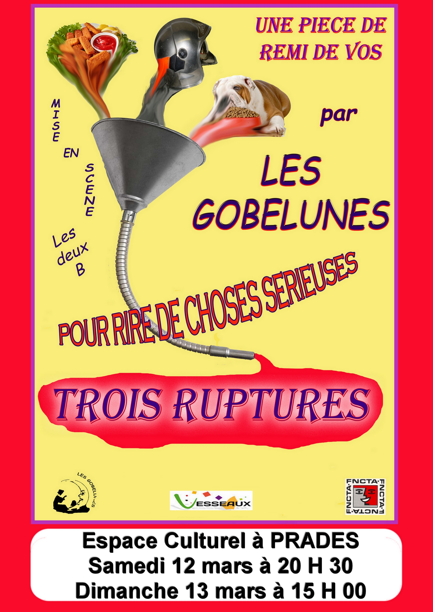 Ces « Trois Ruptures » de Rémi de Vos sont trois histoires absurdes et tragiques(?), mais drôles qui ébranlent certains fondamentaux de nos sociétés comme la domination masculine, la place de la femme, la question de l’homosexualité et l’avènement de la toute-puissance de l’enfant. Les Gobelunes ont tenté de pousser au maximum ces effets de ruptures et de folie en cassant quelques « a priori » théâtraux.