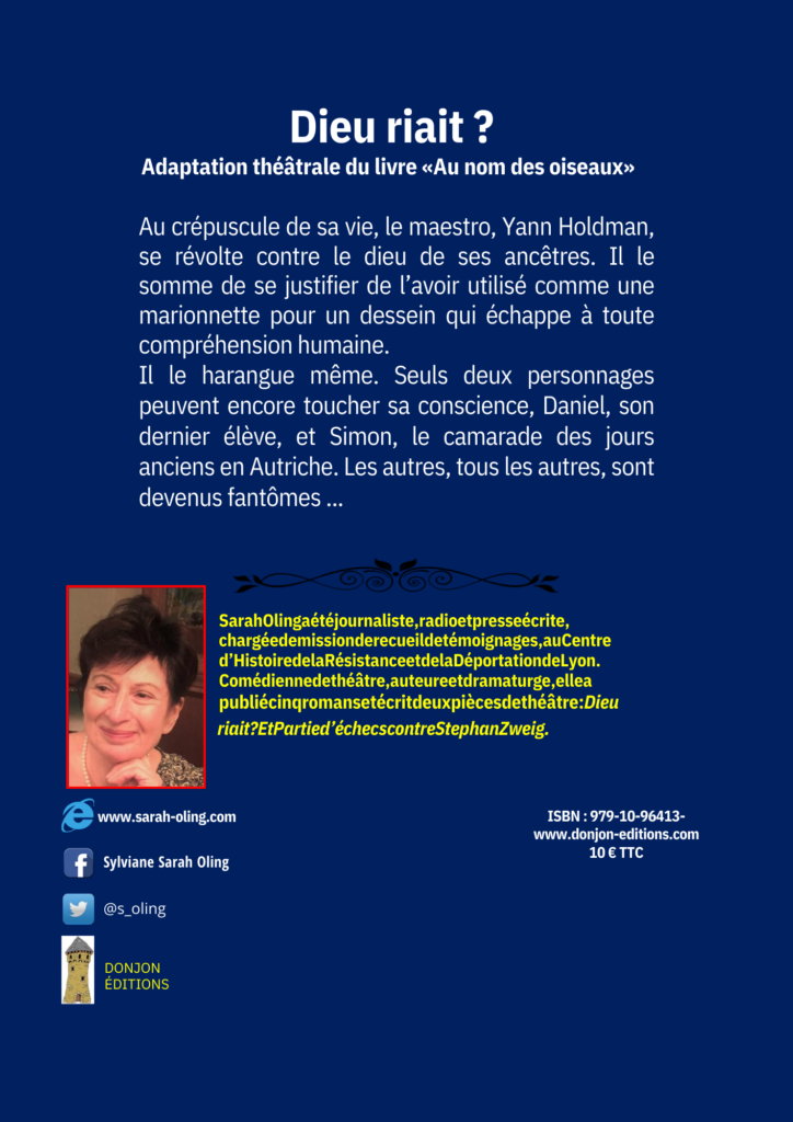 Dieu riait ? a été mis en voix sur la scène du cinéma l’Etoile, par Alain Bourbon, aux Rendez-Vous d’Automne du Festival National de Théâtre de Châtillon-sur-Chalaronne, le 4 octobre 2020, avec le soutien de Jean-Paul Alègre, ancien président de la SACD et dramaturge et la présence amicale de Catherine Terzieff . Alain Bourbon, qui a été à mes côtés pendant toute l’écriture de ma pièce, et m’a inspirée à de nombreuses reprises, poursuit ponctuellement cette mise en lumière. Il a, avec des comédiens, entre autres Vincent Tantaro pour le rôle de Yann Holdman, réalisé deux autres lectures, mises en scène et en voix dans des festivals de théâtre amateur, entre autres à Terre de Scènes à Villefranche, en 2021.