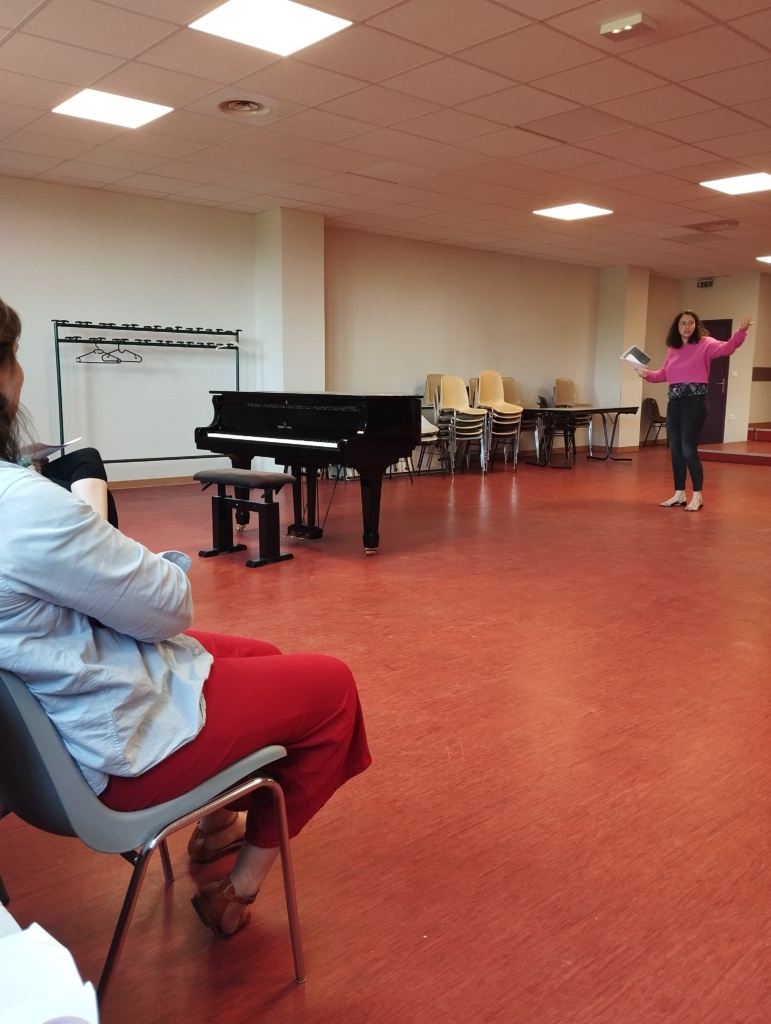 Ensuite elles ont pratiqué la respiration ventrale, dite aussi qualitative. Elle permet plus de puissance et de maîtrise. Elles ont exploré les différentes caisses de résonance, échauffé leurs zygomatiques, les cordes vocales et c’est parti pour quelques virelangues.