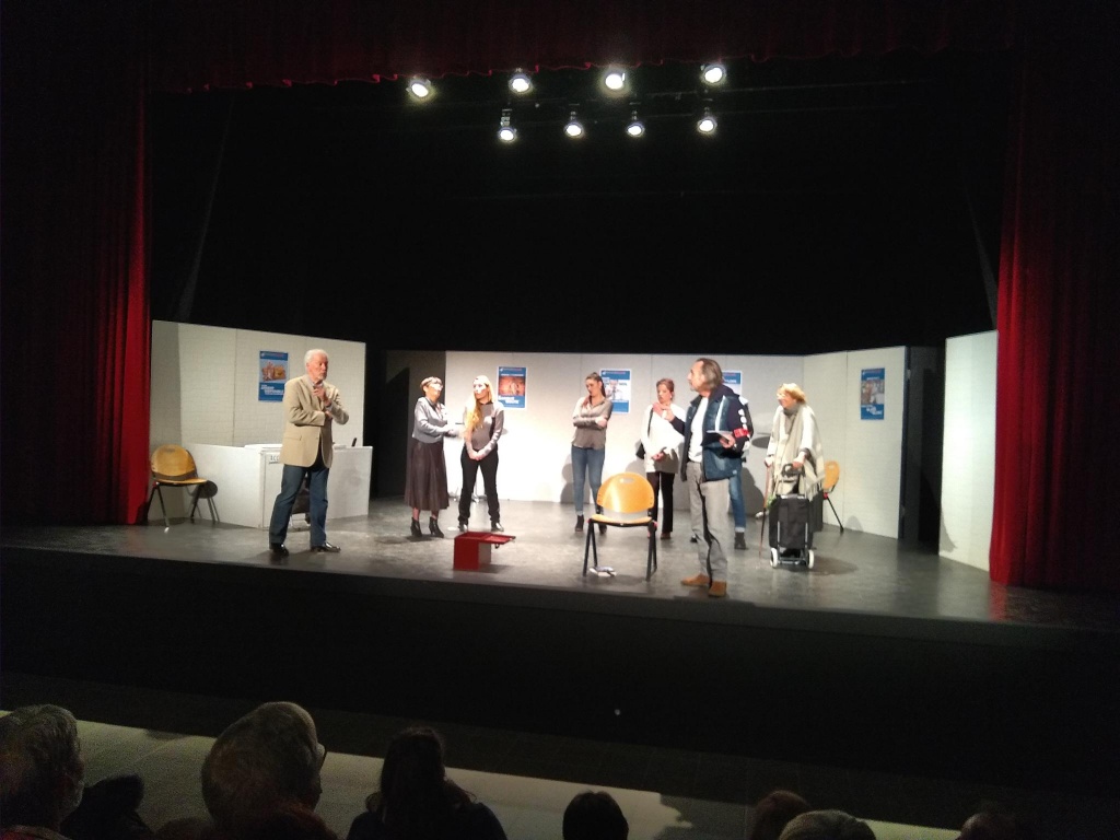 Après le repas du soir, nous avons fini notre journée avec la présentation de la pièce « du flouze, du blé, de l’oseille et des thunes » une comédie policière en 3 actes de JEAN-PAUL CANTINEAUX, par la troupe de Théâtre au village.