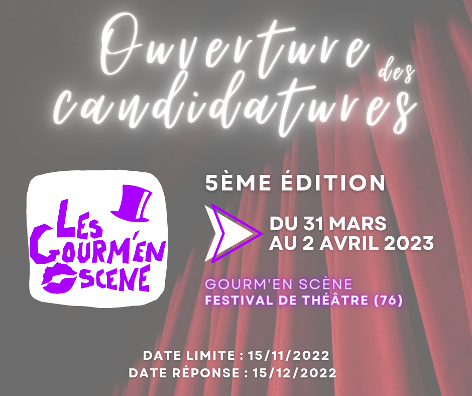 Nous avons le grand plaisir de vous annoncer que la 5ème édition de notre festival de théâtre LES GOURM’EN SCÈNE se déroulera dans le magnifique écrin qu’est l’Espace Beaumarchais à Maromme (76) du 31 mars au 2 avril 2023.