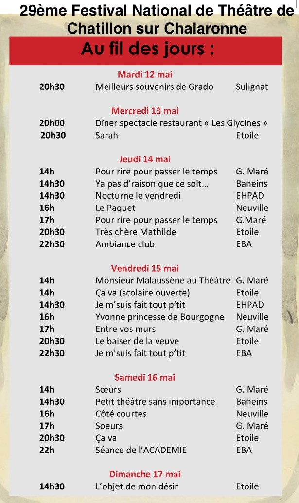 Châtillon, charmante petite ville fleurie de l’Ain, sur les rives de la Chalaronne, à quelques dizaines de km de Lyon, héberge chaque année, depuis 1987, l’un des trois festivals nationaux de la Fédération nationale des compagnies de théâtre amateur (FNCTA), le seul consacré exclusivement au théâtre contemporain (textes écrits après 1945).