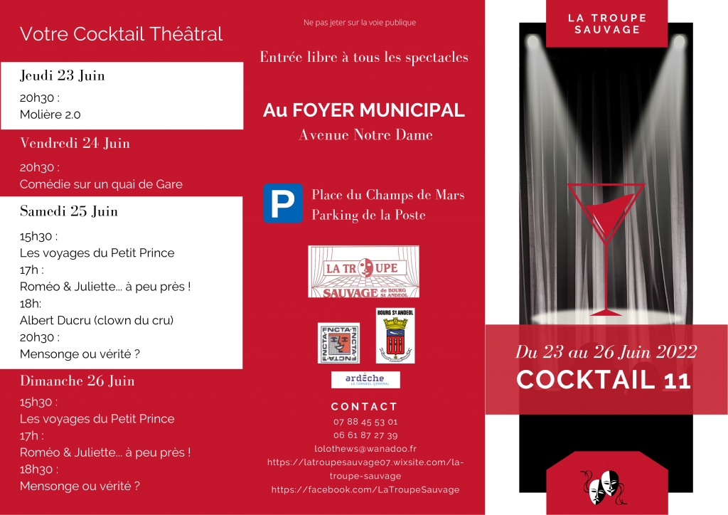 Pour sa 11ème édition, la Troupe Sauvage organisera son festival Cocktail, du jeudi 23 juin au 26 juin au Foyer Municipal de Bourg-Saint-Andéol.