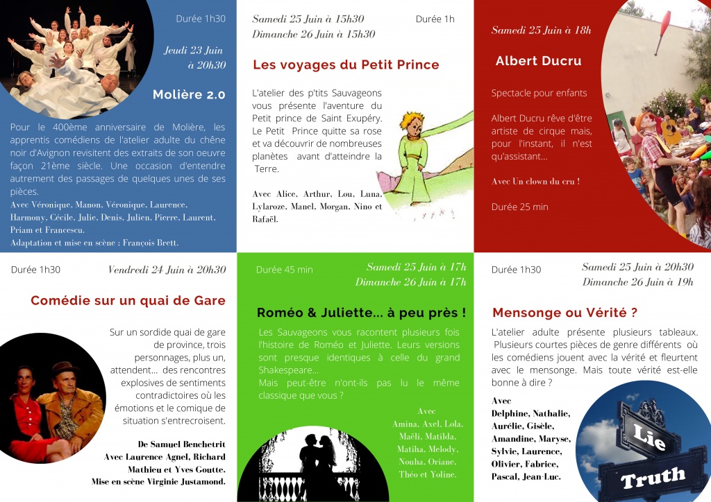 L’occasion de voir les pièces des différents groupes et ateliers de la Troupe, ainsi que d’une troupe invitée, l’Atelier adultes du chêne noir d’Avignon.