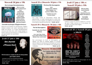 Comme chaque année, la Troupe Sauvage vous propose son cocktail théâtral avec le travail des p’tits sauvageons, des sauvageons et des grands sauvages ! Mais aussi des troupes amies ! Avec des spectacles variés, il y en a pour tous les goûts et nous avons besoin de vous pour faire vivre le théâtre au foyer municipal de Bourg Saint Andéol.