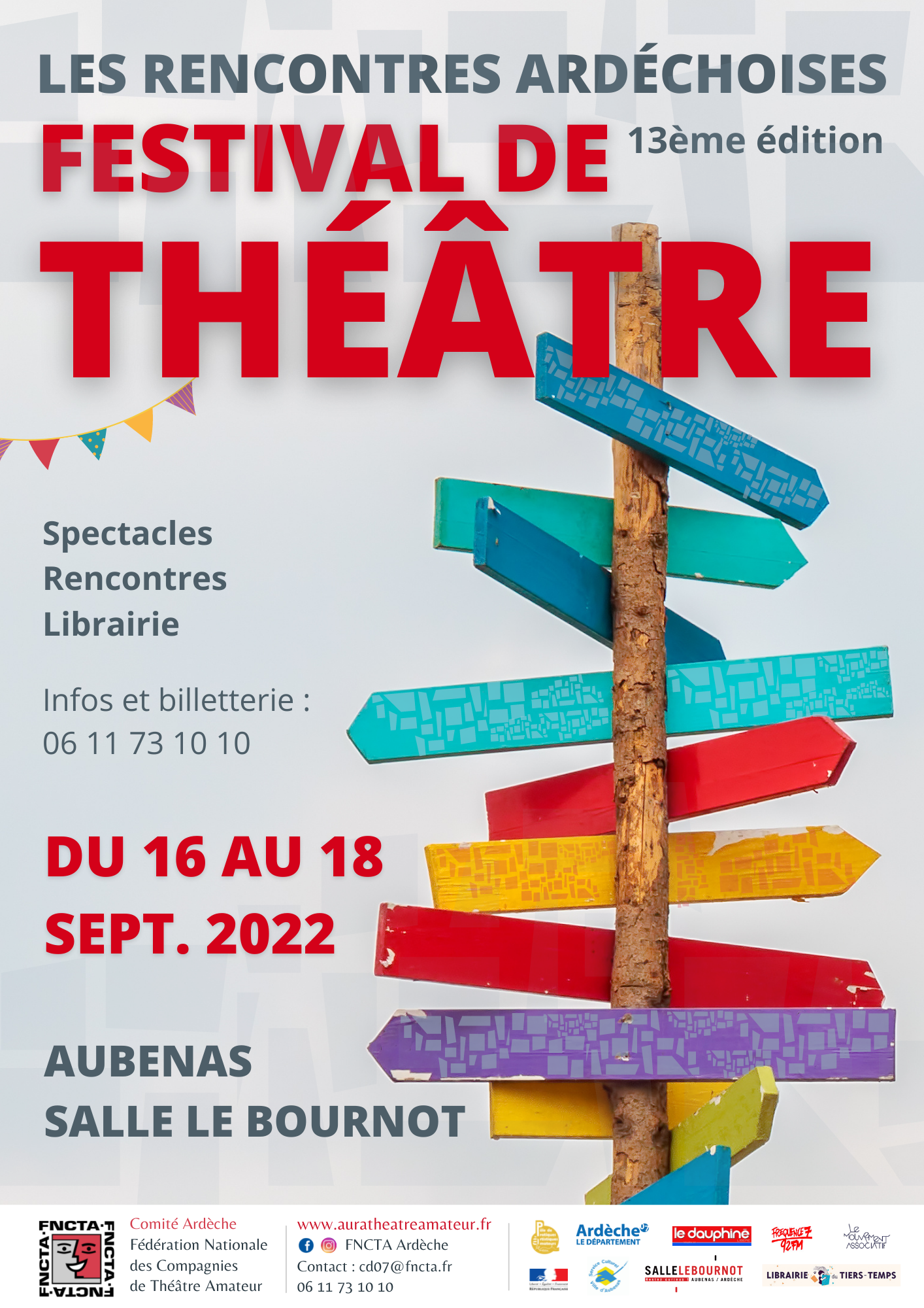 La 13e édition du Festival de Théâtre Les Rencontres Ardéchoises aura lieu du 16 au 18 septembre 2022 à la Salle le Bournot (Aubenas, Ardèche) !