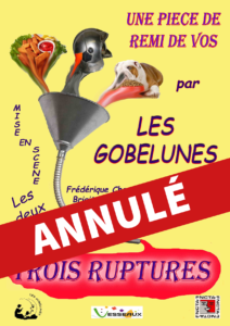 Trois Ruptures (Rémi De Vos) · Les Gobelunes (Vesseaux · 07)En raison de cas de COVID dans la troupe des Gobelunes, nous sommes contraints d’annuler leur représentation qui devait avoir lieu le vendredi 16 septembre à 20h30.
