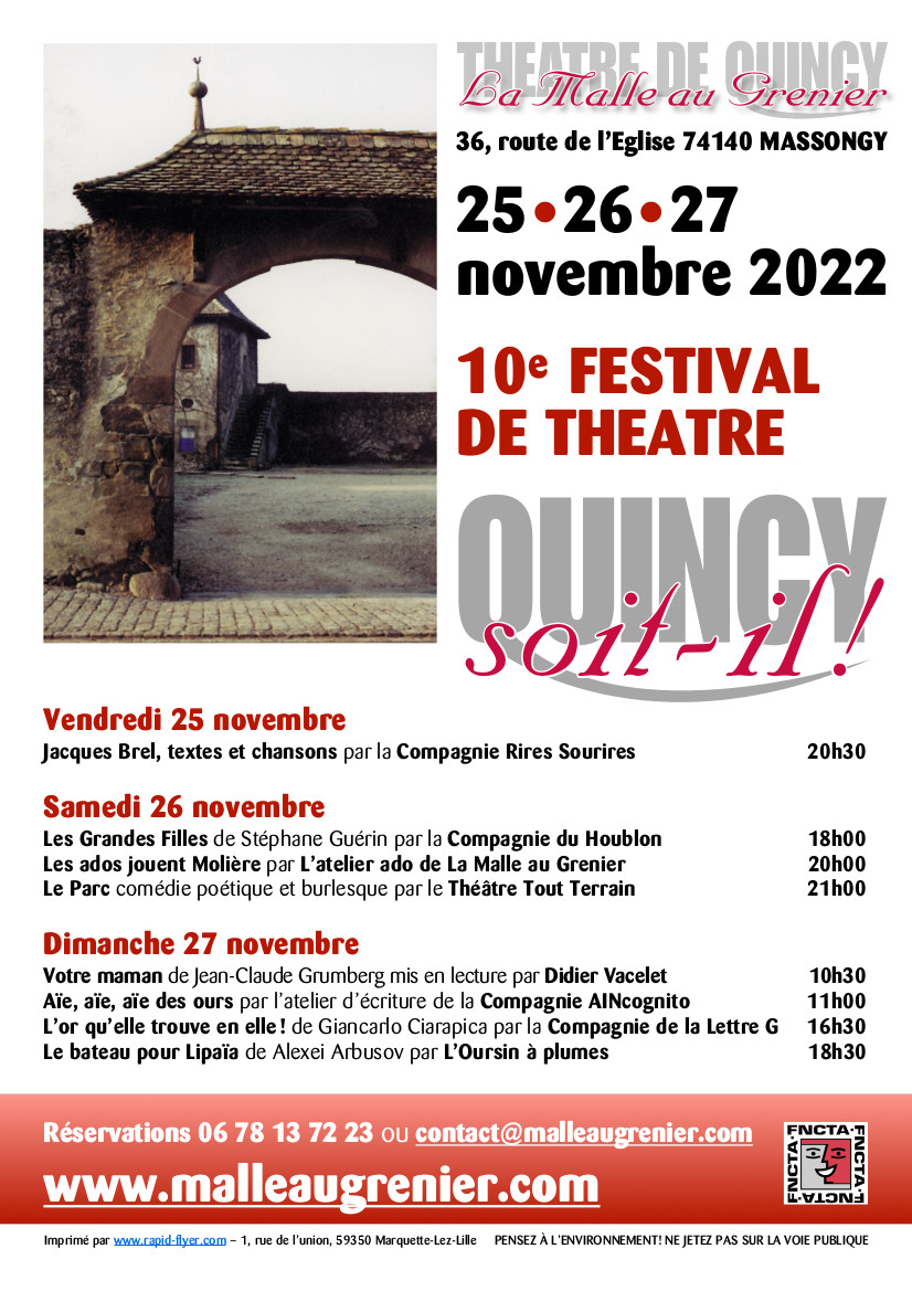 « Tous les Évènements Cet évènement est passé Festival “Quincy soit-il!” 25 novembre 2022 à 0 h 00 min - 27 novembre 2022 à 0 h 00 min Free « BABY-MEURTRE Quand la Chine téléphonera » Par Catherine_Canovas (Savoie & Haute-Savoie)Festival “Quincy soit-il!”25 novembre 2022 à 0 h 00 min - 27 novembre 2022 à 0 h 00 min - théâtre de Quincy / salle des fêtes de Massongy Ajouter au calendrier Google Agenda iCalendar Outlook 365 Outlook Live Tout ce qu'il faut savoir Détails Début : 25 novembre 2022 à 0 h 00 min Fin : 27 novembre 2022 à 0 h 00 min Prix : Free Type d'évènement : Festivals et Rencontres Site : https://malleaugrenier.com/ Organisateur Troupe : LA MALLE AU GRENIER MASSONGY 74140malleaugrenier.comResponsable de la troupe :Mme CATHERINE CANOVAScontact@malleaugrenier.com Other Type d'évènement Festivals et Rencontres Lieu Lieu : théâtre de Quincy / salle des fêtes de Massongy 36 route de l'église massongy, 74140 Voir Lieu site web Related Évènements Dialogues d’homos sapiens 18 décembre 2025 à 20 h 30 min - 22 h 00 min Event Series Parcours Shakespeare – Ados 8 janvier 2026 à 20 h 00 min - 13 septembre 2026 à 19 h 00 min Dialogues d’homos sapiens 9 janvier 2026 à 20 h 30 min - 22 h 00 min Event Series