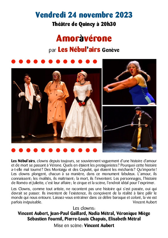 Les Nébul’airs, clowns depuis toujours, se souviennent vaguement d’une histoire d’amour et de mort se passant à Vérone. Quels en étaient les protagonistes? Pourquoi cette histoire a-t-elle mal tourné? Des Montaigu et des Capulet, qui étaient les méchants? Qu’importe! Les clowns plongent, chacun à sa manière, dans ce monument fabuleux. L’amour, ils connaissent; les rivalités, ils maîtrisent; la mort, ils l’inventent. Les personnages, l’histoire de Roméo et Juliette, c’est leur affaire; le cirque et la scène, l’endroit idéal pour l’exprimer.
