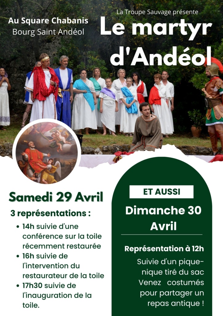 À l’occasion de l’inauguration de la restauration d’une toile monumentale dans l’église de Bourg-Saint-Andéol, La Troupe Sauvage jouera une version allégée de leur péplum “Le Martyr d’Andéol” le samedi 29 et le dimanche 30 avril au square Chabanis.