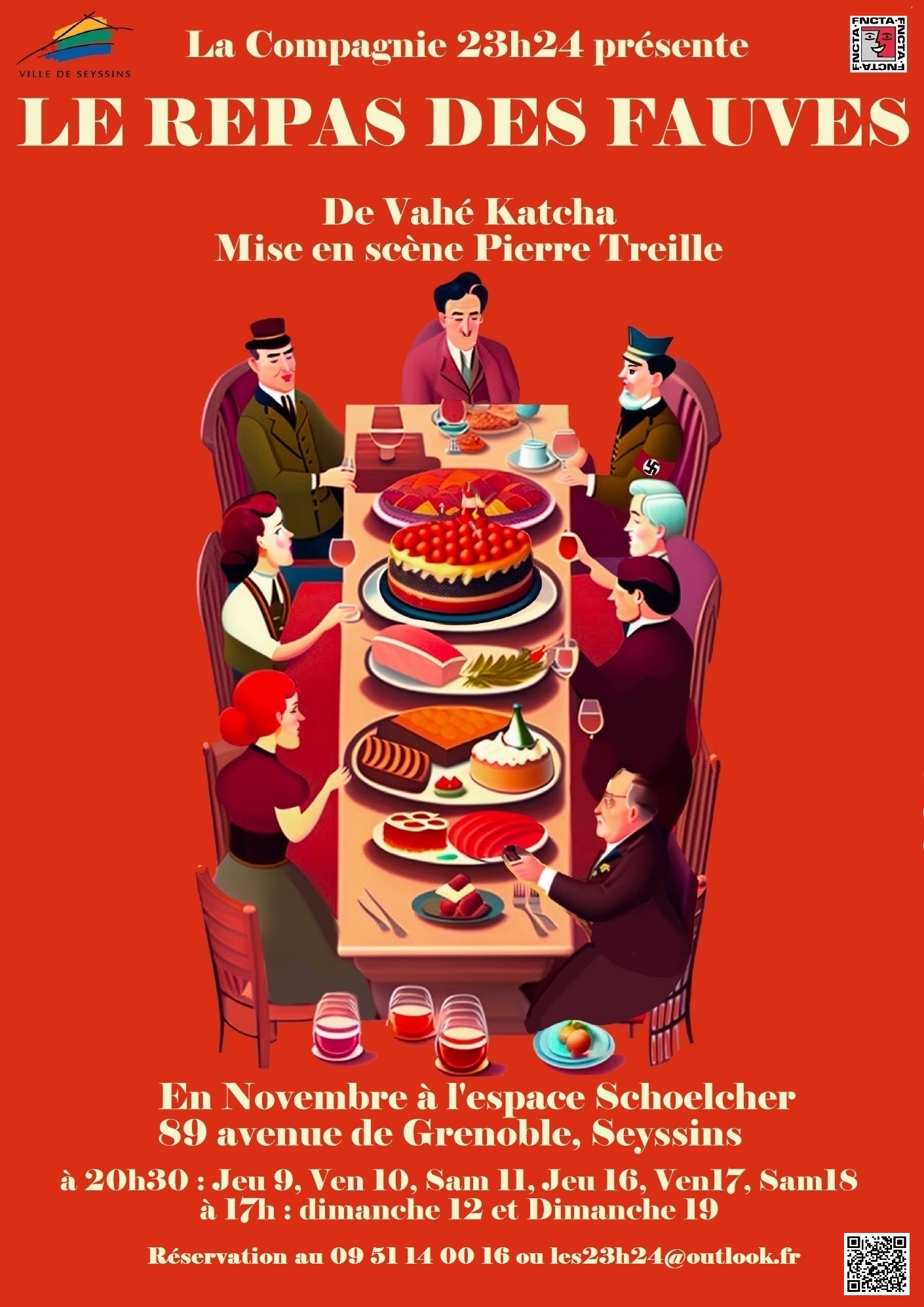 de Vahé Katcha, adaptation de Julien Sibre par la compagnie seyssinoise “23heures24”. Mise en scène : Pierre Treille . Avec : Francesca Bonaccorso-Ravel, Emmanuel Dubreuil, Thierry Durand, Jean-Claude Exbrayat, Francette Maeder, Stéphane Pachurka, Pierre Sikirdji, Bruno Vessière “Pendant l’Occupation allemande à Paris, des amis se retrouvent joyeusement pour fêter l’anniversaire d’un des leurs. Mais la soirée bascule lorsque le commandant SS Kaubach et ses hommes envahissent leur immeuble et les contraignent à faire un choix très difficile : sacrifier deux des leurs pour sauver le reste du groupe. Cette pièce de Vahé Katcha offre une expérience théâtrale émotionnellement intense, alternant habilement entre moments poignants et moments drôles. Les dialogues incisifs, la personnalité complexe des protagonistes et les rebondissements dramatiques maintiennent les spectateurs en haleine. “Le Repas des fauves” interroge la nature humaine face à des choix moralement ambigus, tout en offrant un mélange unique d’émotions. Mais vous… qu’auriez vous fait ?