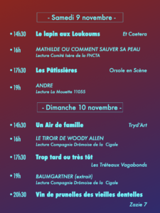 « Tous les Évènements Cet évènement est passé RENCONTRES DU VIVIER 9 novembre 2024 - 10 novembre 2024 « “Le Retour de Richard 3 par le train de 9h24” Lieu : Espace Schoelcher, SEYSSINS LA FONTAINE AU TRIBUNAL DES ANIMAUX » Par Francoise_Aufauvre (Drôme)RENCONTRES DU VIVIER9 novembre 2024 - 10 novembre 2024 - SCENE ASSOCIATIVE PRIVEE DU VIVIER RENCONTRES DES COMPAGNIES DROMOISES ADHERENTES A LA FNCTA Ajouter au calendrier Google Agenda iCalendar Outlook 365 Outlook Live Tout ce qu'il faut savoir Détails Début : 9 novembre 2024 Fin : 10 novembre 2024 Type d'évènement : Festivals et Rencontres Organisateur Troupe : Comité Départemental Drôme https://www.auratheatreamateur.fr/comite-departemental-drome/https://www.facebook.com/CD26FNCTA/Responsable de la troupe :Mme FRANÇOISE AUFAUVREcd26@fncta.fr Other Type d'évènement Festivals et Rencontres Lieu Lieu : SCENE ASSOCIATIVE PRIVEE DU VIVIER 930 Chemin des Trois Communes 930 Chemin des Trois Communes, 26160 + Google Map Phone 0632679909 Related Évènements Parcours Shakespeare – Ados 8 janvier 2026 à 20 h 00 min - 13 septembre 2026 à 19 h 00 min