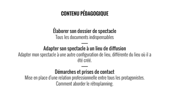 – Entrer en relation avec les professionnels du spectacle vivant avec des outils adéquats : planning et rétro-planning, plan d’adaptation, dossier