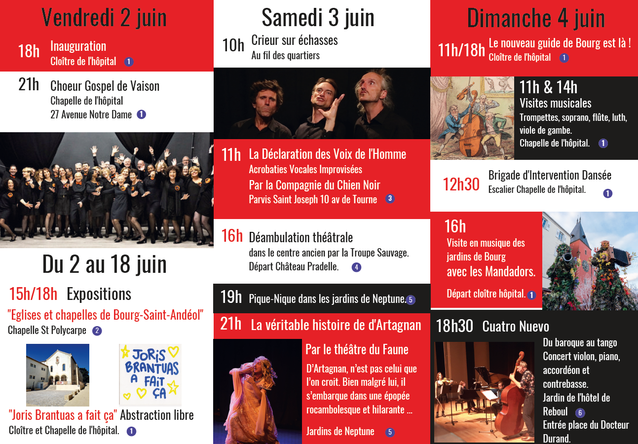 Gospel, tango, trompettes baroques, acrobaties vocales, déambulation théâtrale en ville, expositions, pièce de théâtre en plein air…Il y en aura pour tous les goûts et les publics.Et c’est entièrement gratuit. Un but : associer arts et patrimoine ancien pour fêter la ville de Drôme Ardèche qui compte le plus de monuments classés