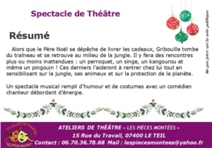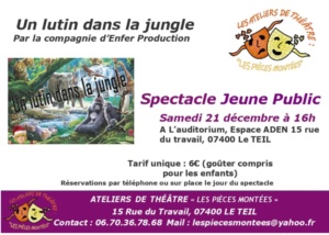 « Tous les Évènements Cet évènement est passé UN LUTIN DANS LA JUNGLE 21 décembre 2024 à 16 h 00 min - 17 h 00 min 6€ « Addition, une comédie de Clément Michel Bidules trucs. De Pierre Notte » Par Christina Juhl (Ardèche)UN LUTIN DANS LA JUNGLE21 décembre 2024 à 16 h 00 min - 21 décembre 2024 à 17 h 00 min - Espace Aden Par la Compagnie d’Enfer Production accueillie par Les Pièces Montées. Ajouter au calendrier Google Agenda iCalendar Outlook 365 Outlook Live Tout ce qu'il faut savoir Détails Date : 21 décembre 2024 Heure : 16 h 00 min - 17 h 00 min Prix : 6€ Type d'évènement : Spectacles Évènement Tags:Jeune public, Le Teil, Les Pièces Montées, Un lutin dans la jungle Organisateur Troupe : AT. THEATRE LES PIECES MONTEES LE TEIL 7400https://www.lespiecesmontees.comResponsable de la troupe :M. THIERRY TAULEIGNElespiecesmontees@yahoo.fr Other Type d'évènement Spectacles Lieu Lieu : Espace Aden 15 rue du travail Le Teil, 07400 + Google Map Related Évènements Parcours Shakespeare – Ados 8 janvier 2026 à 20 h 00 min - 13 septembre 2026 à 19 h 00 min Le Cabaret des Bretelles à Bascules 15 janvier 2026 à 20 h 00 min - 22 h 00 min LA FERME HANTÉE – LES PIQUEBERLES 7 février 2026 à 18 h 00 min - 20 h 00 min