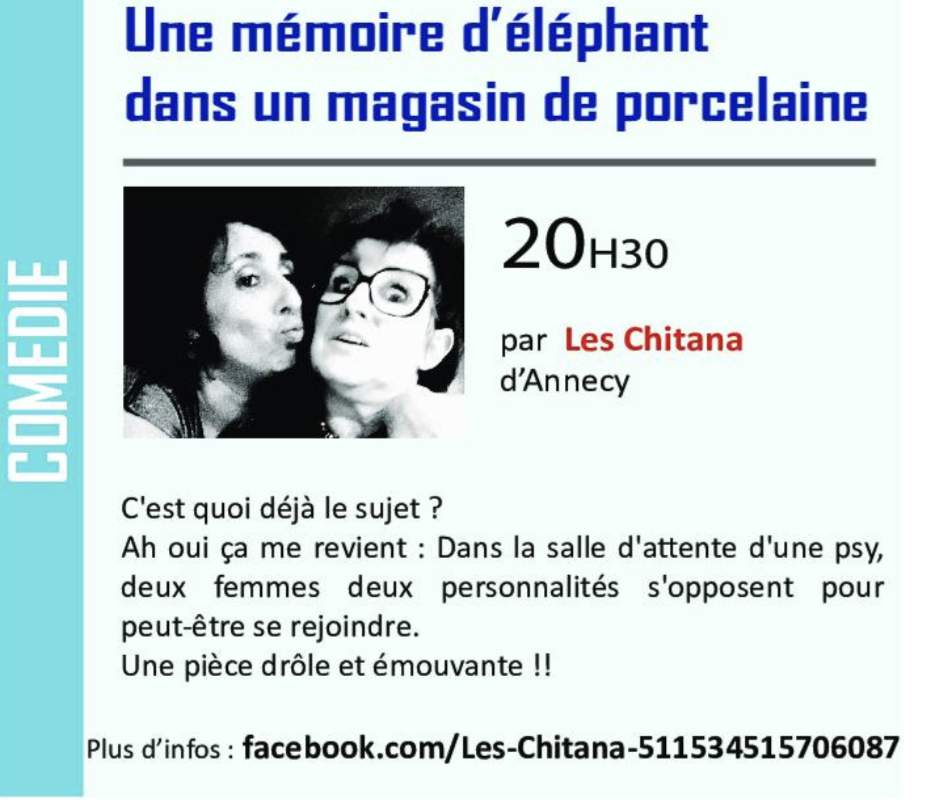 « Tous les Évènements Cet évènement est passé Une mémoire d’éléphant dans un magasin de porcelaine 26 février 2022 à 20 h 30 min - 21 h 30 min 5€ à 7€ « Camille et Paul. Folie, un autre mot pour amour Du flouze, du blé, de l’oseille et des thunes! » Par Christina Juhl (Ardèche)Une mémoire d’éléphant dans un magasin de porcelaine26 février 2022 à 20 h 30 min - 26 février 2022 à 21 h 30 min - Salle des fetes Mairie Ajouter au calendrier Google Agenda iCalendar Outlook 365 Outlook Live Tout ce qu'il faut savoir Détails Date : 26 février 2022 Heure : 20 h 30 min - 21 h 30 min Prix : 5€ à 7€ Type d'évènement : Spectacles Évènement Tags:hivernales, les chicanas, Les Pièces Montées Site : https://www.facebook.com/lespiecesmontees/ Organisateur Troupe : COMPAGNIE CHITANA SAINT-FELIX 74540Responsable de la troupe :Mme NAIMA BEHLOUL BARBIERnams.bar@orange.fr Other Type d'évènement Spectacles Lieu Lieu : Salle des fetes Mairie place Paul Avon LE TEIL, 07400 France + Google Map Related Évènements Dialogues d’homos sapiens 18 décembre 2025 à 20 h 30 min - 22 h 00 min Event Series Parcours Shakespeare – Ados 8 janvier 2026 à 20 h 00 min - 13 septembre 2026 à 19 h 00 min Dialogues d’homos sapiens 9 janvier 2026 à 20 h 30 min - 22 h 00 min Event Series