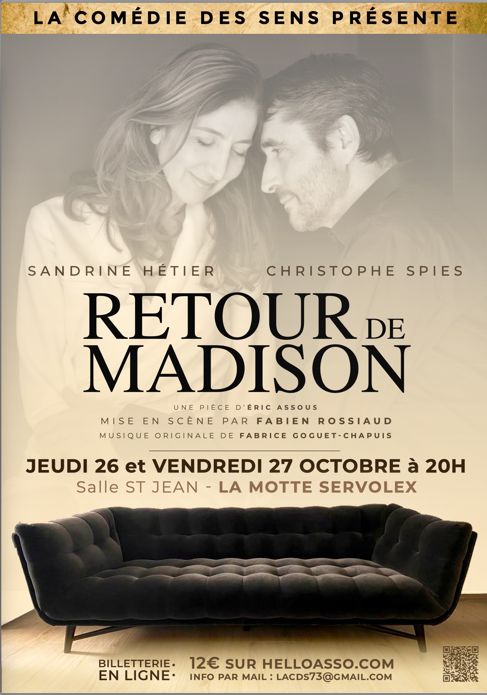 Le tremplin Rue genette, Epagny-Metz Tessy - Savoie & Haute-SavoieRETOUR DE MADISON une comédie de Eric Assous Mise en scène Fabien Rossiaud Ils viennent de regarder "Sur la route de Madison" à la télé. Elle est bouleversée.....il ne comprend pas pourquoi un tel…
