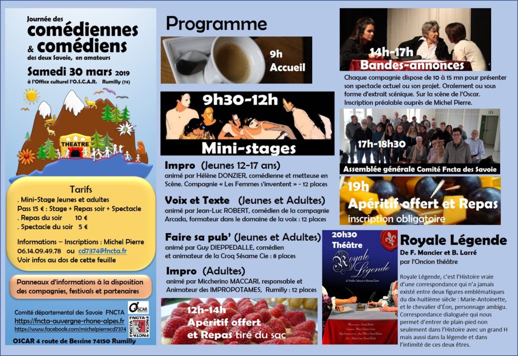 Mini-stages. Bandes-annonces des spectacles des compagnies. Assemblée générale du Comité des Savoie. Spectacle du soir.