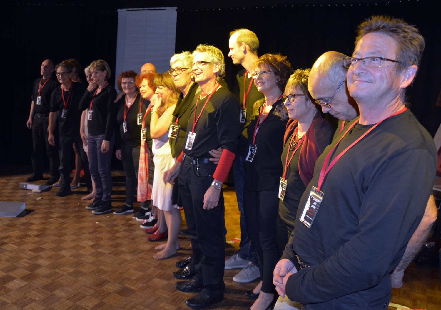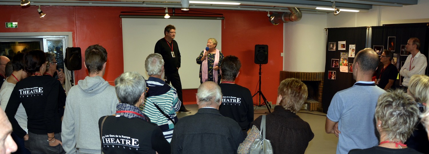 Tu aurais été étonnée. Subjuguée. Fascinée peut-être. Le nombre, la disponibilité et le sourire des bénévoles. De la technique Lumière et Son à la gastronomie, en passant par l’accueil et la billetterie. Du photographe et du vidéaste à l’équipe de service à table. Une fourmilière. Originalité : Michel Pierre, Responsable du festival, metteur en scène et subtile écrivain, a imaginé et écrit quelques petites formes sur le monde du théâtre. Que les Gars de la Rampe ont joué en guise d’introduction avant chaque spectacle. Humour fin et amusant. Comédiens de grand talent. (Voir les images ci-dessous).