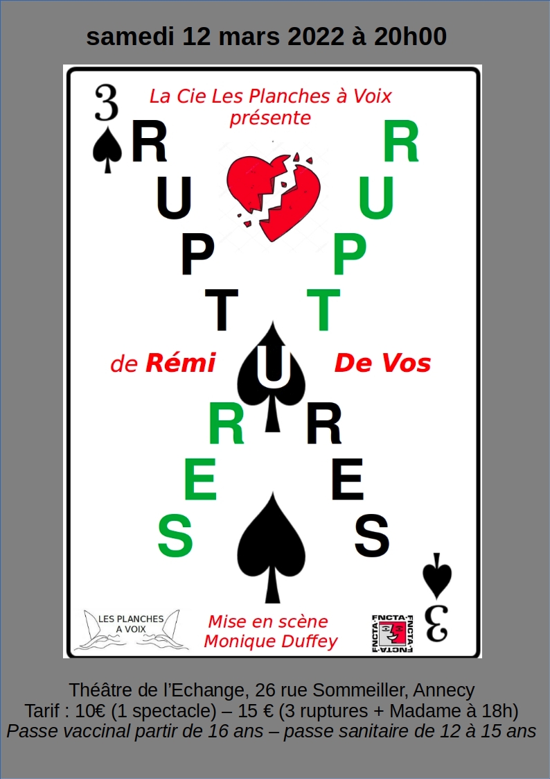 DEUX COMPAGNIES - DEUX PIECES - UN AUTEUR !A 18h, La Cie Les Femmes S'Inventent, d'Annecy, jouent MADAMEA 20h, la Cie Les Planches à Voix jouent TROIS RUPTURES :Une comédie grinçante. Rémi De Vos décortique…