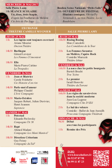 Les Escholiers se sont fixés deux objectifs primordiaux. Le premier, montrer au plus grand nombre de spectateurs Annéciens et touristes, que le théâtre amateur offre très souvent une qualité de spectacle qui n’a rien à envier au théâtre professionnel. Le deuxième, faire de ce festival un moment d’échanges et de rencontres. C’est pourquoi nous mettons un point d’honneur à recevoir les festivaliers de la manière la plus conviviale possible.Notre volonté est d’accepter tous les styles à condition que la dominante soit théâtrale mais le spectacle peut contenir musique et danse.