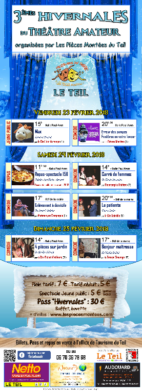 Réservations obligatoires avant le 20 février 2018 à l’office du tourisme du TEIL ou par téléphone au 06.70.36.78.68.