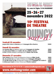 La Malle au Grenier organise depuis 2012 son festival de théâtre amateur : Quincy soit-il ! Cette année , le festival a fêté ses 10 ans les 25, 26 et 27 novembre et a réuni Plus de 400 spectateurs et 15 bénévoles !