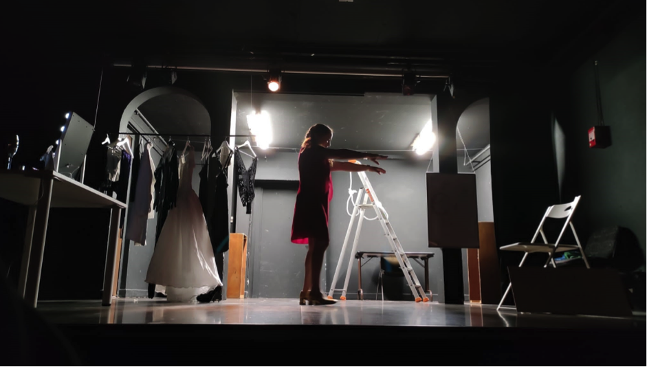 Sur cette pièce, nous avons modifié complètement la mise en scène d’origine, qui était que la metteuse en scène et la comédienne étaient toutes les deux sur scène. Nous avons choisi de placer la metteuse en scène en régie pendant toute la pièce : depuis la régie elle donne les instructions à la comédienne qui est toute seule sur scène. Je me retrouve donc dans un cas de figure qui s’apparente à un seule en scène (vu que je suis seule sur scène !), même si on me donne la réplique ! C’est aussi un bon exercice ! Et c’est très drôle de jouer la confrontation entre deux égos surdimensionnés !