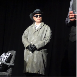 Sur cette dernière pièce, c’était très intéressant car ça m’a permis de jouer 2 personnages différents (un détective maladroit homme et une femme fatale vénéneuse) dans la même pièce, c’était un chouette challenge ! La metteuse en scène a poussé à fond l’esthétique années 50 / polar à la Hitchcock, nous avons travaillé en amont les costumes, les décors, l’éclairage, c’était une superbe expérience et une belle réussite !