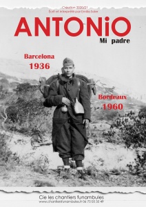 Elle présente un spectacle, intitulé Antonio, mi padre, l’histoire d’un père, son père, qui a combattu pendant la guerre d’Espagne avec les républicains, contre Franco. C’est une pièce écrite et réalisée par cette comédienne, qui relate son histoire et sa relation avec son père.