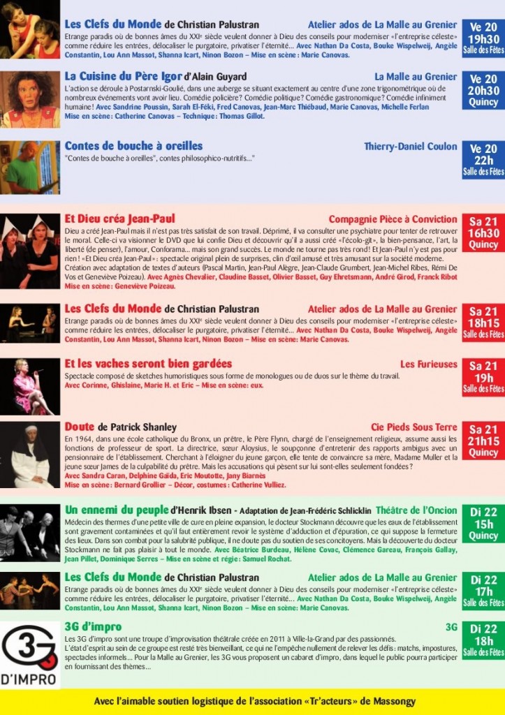 Le programme complet de ce 3° festival de Massongy, Haute Savoie. La Malle au Grenier l’organise. L’entrée est libre avec chapeau à la sortie.