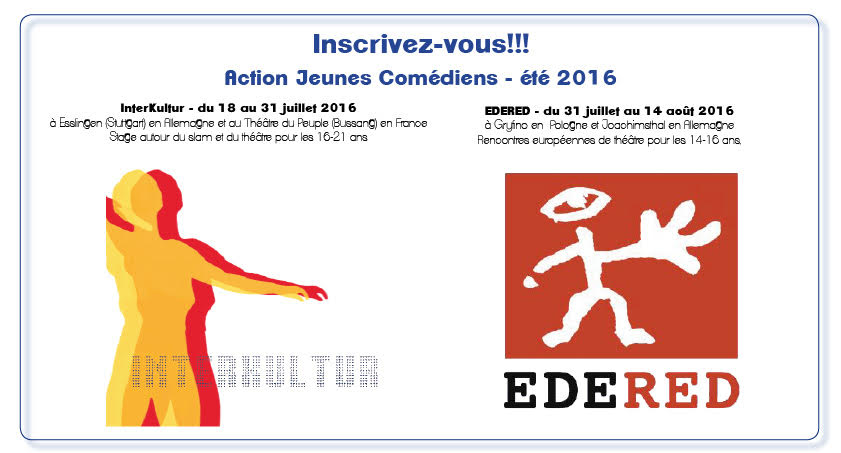 INTERKULTUR 2016Six jeunes français rejoindront six jeunes allemands, entre 16 et 21 ans, du 18 au 24 juillet 2016 à Esslingen (Stuttgart) 2015 en Allemagne, puis du 24 au 31 juillet à Bussang au Théâtre du Peuple lors du festival annuel. Comme l’année dernière, le Slam sera à l’honneur. Les deux semaines seront dirigées par Dominique Macri, slameuse allemande, et Simon Capelle, comédien et metteur en scène français. Ensemble ils travailleront sur l’écriture de textes, les techniques du jeu théâtral et sur la réalisation d’un spectacle final.