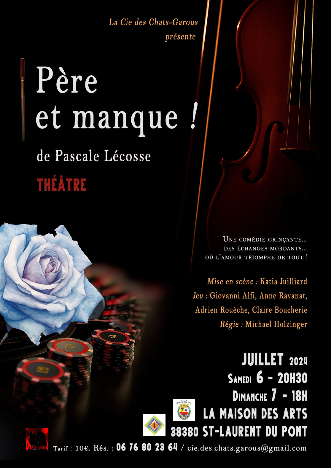 la Cie des Chats-Garous vous propose de venir découvrir les samedi 6 juillet à 20h30 et dimanche 7 juillet à 18h : “Père et manque!“ une comédie grinçante née de la plume pétillante et sensible…