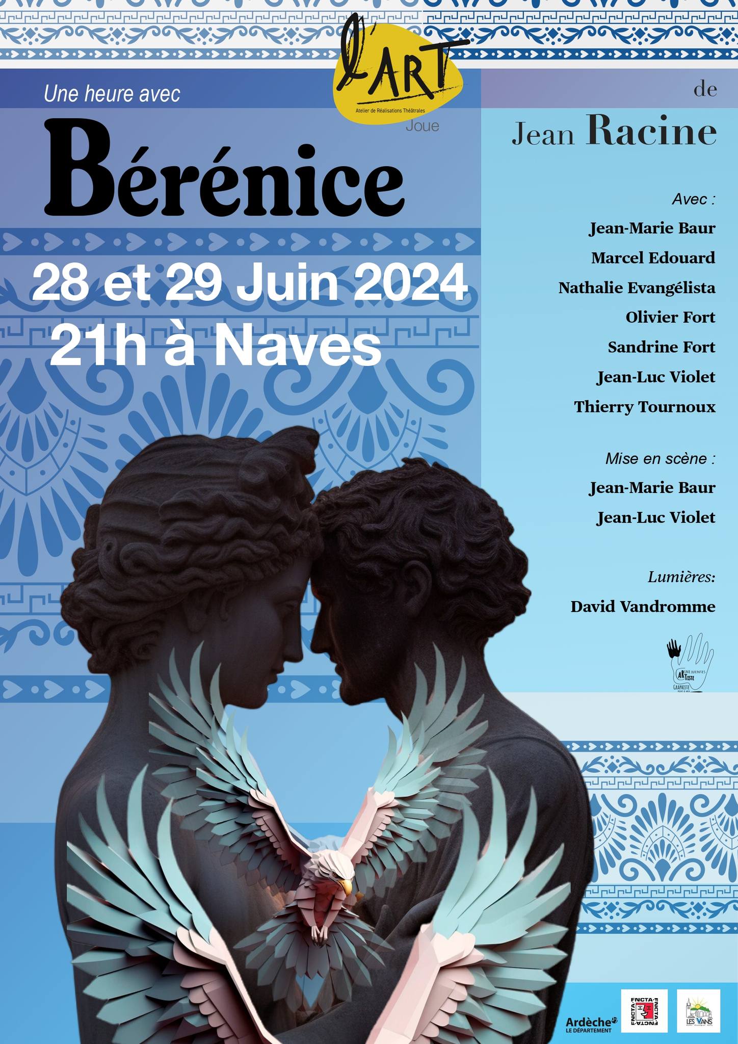 L’ART joue “Bérénice” de Jean Racine Vendredi 6 septembre à 21h00 aux Assions (salle polyvalente) Avec : Jean-Marie Baur, Marcel Edouard, Nathalie Evangelista, Olivier Fort, Sandrine Fort, Jean-Luc Violet, Thierry Tournoux Lumières : David Vandromme Mise en scène : Jean-Marie Baur,…