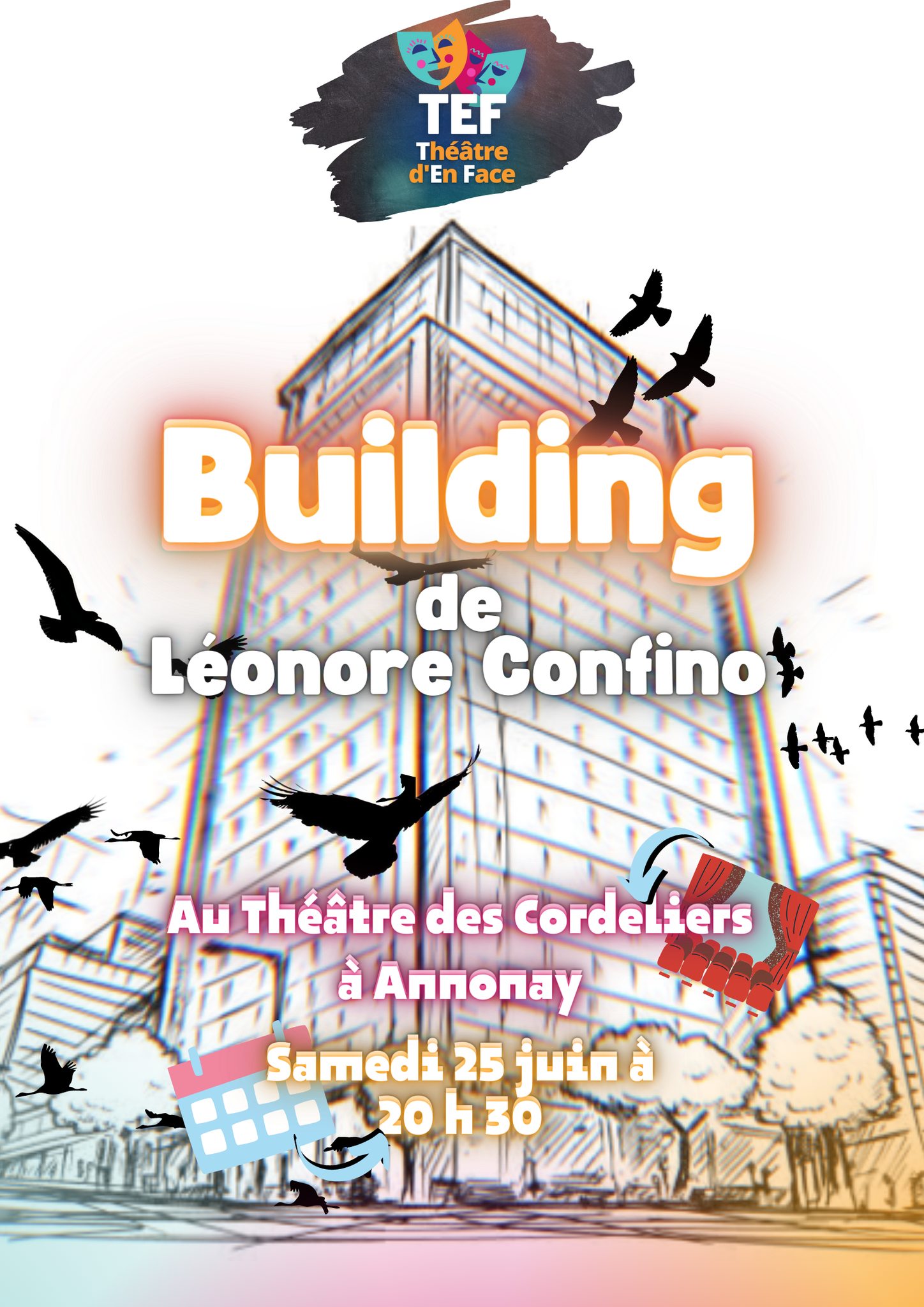 Building par le Théâtre d’En Face le Samedi 25 juin à 20h30 au Théâtre des Cordeliers d’Annonay Une pièce de Léonore Confino La dernière création du TEF (10 comédiens en scène pour 32 personnages)…